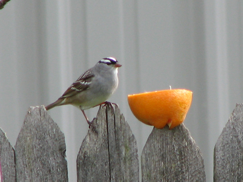 See the White-crowned Sparrow in the video, to the left side? He was really interested in the orange, and when the finches moved on he quickly went to check it out.
