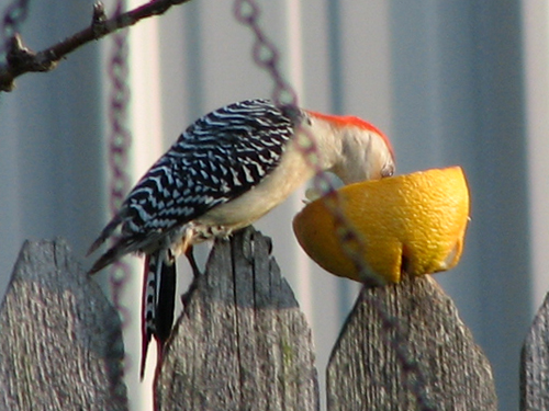 The oranges even managed to attract a Red-bellied Woodpecker, who shunned the available suet for some citrus delight — although he may be snacking on ants attracted by the fruit.