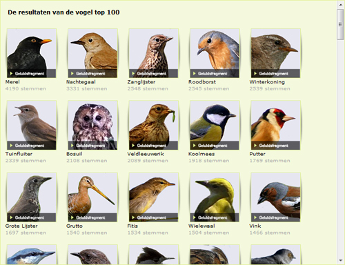 About 5000 people voted for the favorite bird song of Holland and the Blackbird (Merel) came out on top. Rounding out the top five were Nightingale (Nachtegaal), Song Thrush (Zanglijster), Robin (Roodborst) and Winter Wren (Winterkoning). The survey was done by the VARA radio show Vroege Vogels (Early Birds) and they have the entire top 100 list on their website. The neat thing is that it shows a picture of each bird and even includes the song. Among the top birds are the most common back yard birds in the Netherlands, so it’s a great overview of the everyday birds of that part of the world. Let me tell you, listening to those songs made me feel homesick for Holland! Check out the site and do some online international birding!