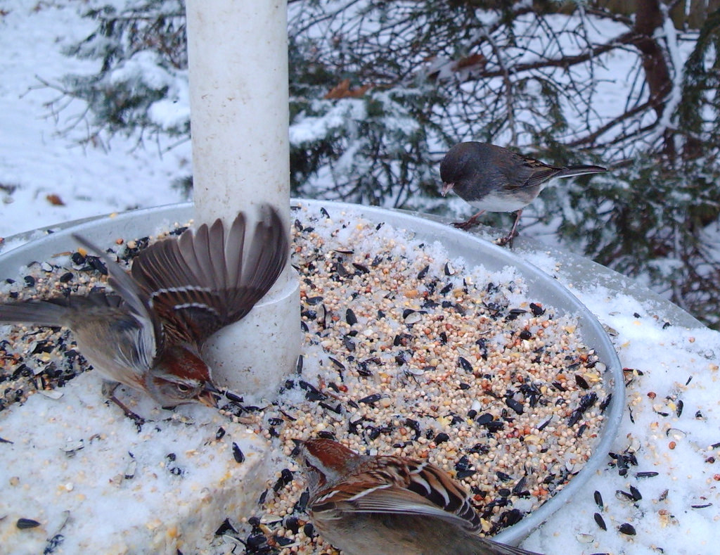 After viewing the cam shots, I am guessing a fight got out of hand and this fellow flew into the window while trying to flee an enemy. I couldn’t find any information about this kind of behavior online. We have previously witnessed large groups of Sparrows feeding both at the feeder and on the ground, without controversy. There was plenty of food available. So what got into them today?