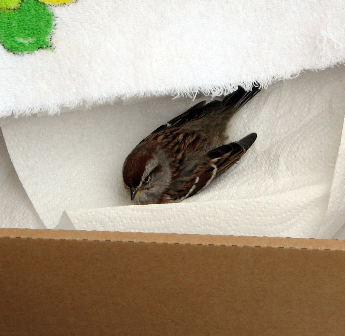 Early in the day, before we looked at the cam photos, one flew into the back sliding door and fell to the ground, dazed. My mom brought him inside and we left him to rest in a shoebox for about 45 minutes. When I brought the box outside and opened it, he flew off after a moment. Here he is in the box shortly before flight.