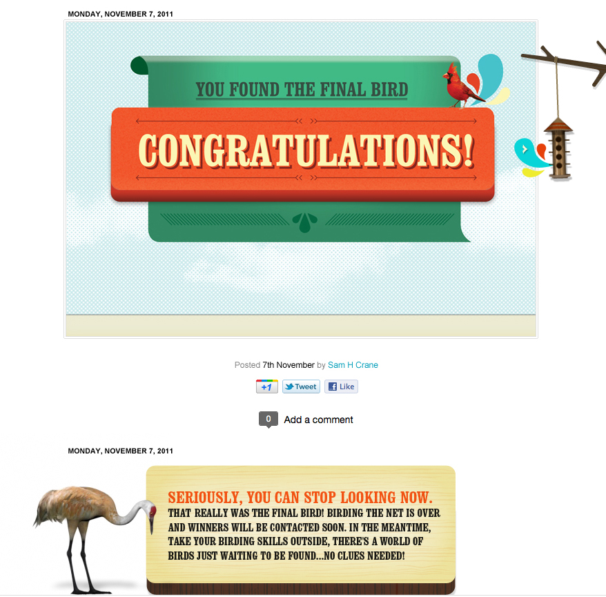 Audubon’s social media campaign-competition Birding the Net began on October 11th. Participants add the app to Facebook and then scour the web for free-flying javascript birdies on various websites, even including this one! Since Arthur and I were entertaining family for the last two weeks, we were pretty much unable to participate. However, with a few Google searches and some mad clicking skills, as of this afternoon we both have 20+ birds. We may or may not have a shot at any of the fabulous prizes, but since I received the following press release just last Friday, it seems Audubon would be more than happy to have more people participating. So, it’s not too late! You’ve got through November 7th to find as many birds as you can. See the full press release below for more info, and check out Audubon.com for more details.