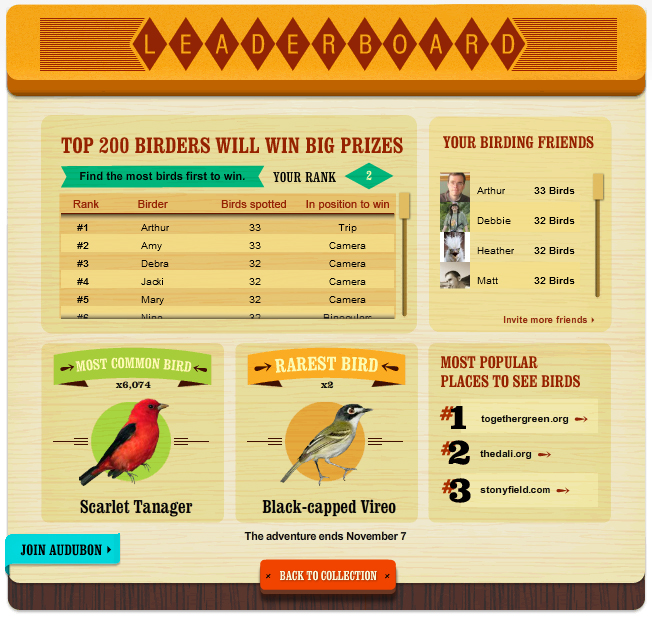 In the recently release film The Big Year, characters compete to see the most North American birds in one year. Birding the Net brings to the Internet the thrill of the chase found in real-world birding, challenging players to spot dozens of species that will be released from Oct. 11 through Nov. 7. Web surfers will observe virtual birds doing the same things that birds do outdoors: animations of birds will fly across homepages, perch on mastheads, and flock to birdhouses that anyone can install on personal websites and blogs. Clicking on the animated birds on the many participating websites takes players to an Audubon Facebook page to collect and trade “bird cards” which feature recordings of birdsongs, bird facts, and video. The first players to collect all the birds will win prizes, including a voyage to the Galapagos Islands.