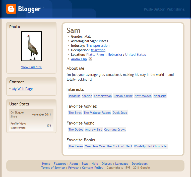Find the blog, read the comments, find the Sandhill Crane profile, click the My Web Page link…