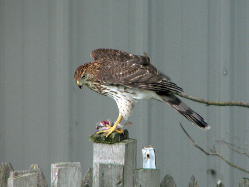 Yesterday Coop caught a House Sparrow and proceeded to eat it on one of our fence posts. This was the first time we’d actually seen the hawk eating, even though we’ve seen piles of feathers on the ground several times, indicating at least a scuffle if not an outright kill. Final warning: Graphic images & video of a hawk eating prey follow.