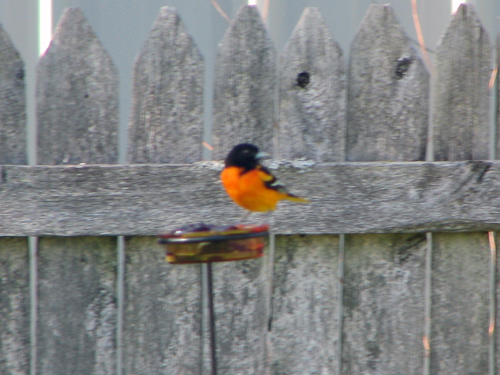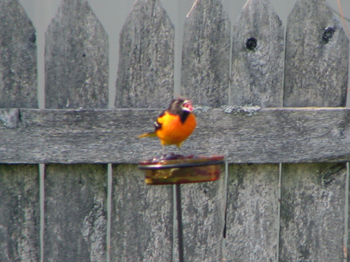 I saw a bird perched on the hummingbird feeder close to the house this morning. It took my just-woken-up brain a moment to process what I was seeing and then I let out a huge GASP which scared Arthur and Arby both. A Baltimore Oriole! He flew back to the jelly feeder after a moment.