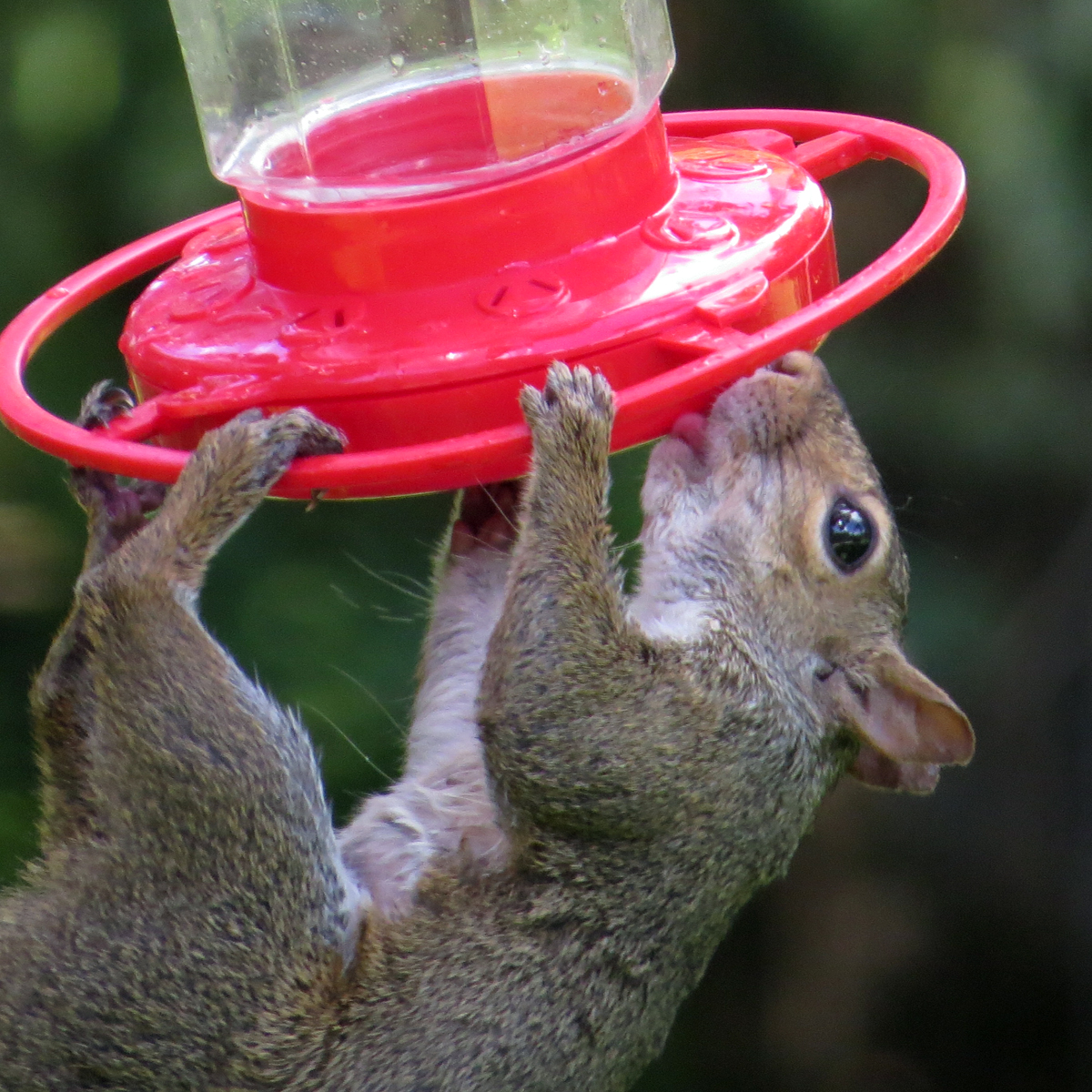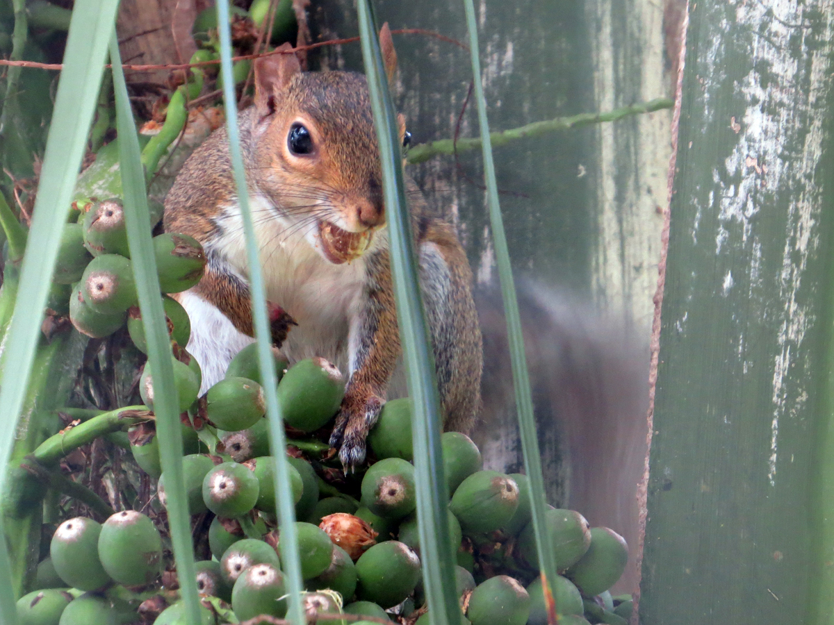 Squirrel monching on Queen Palm nuts — messy trees gone now | July 03 2013