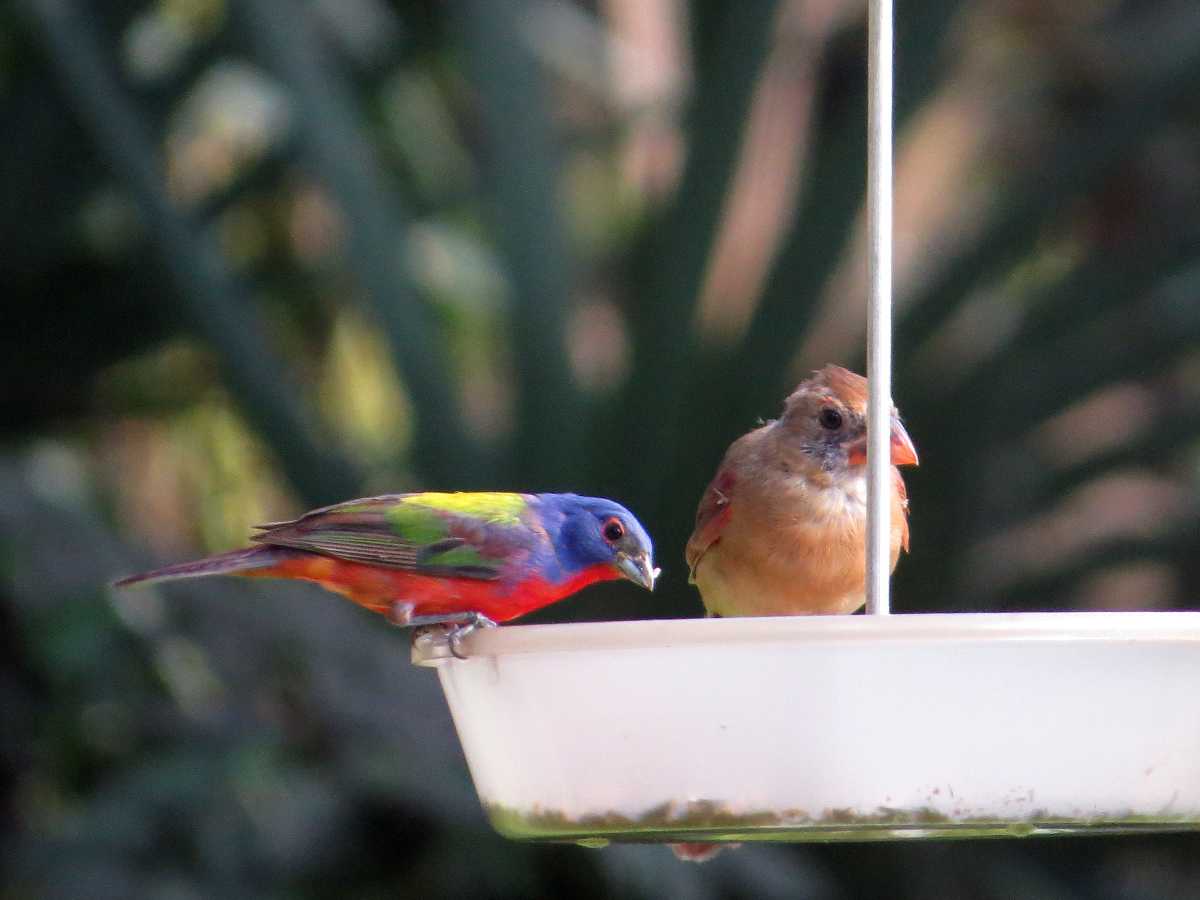 Male Painted Bunting with molting female Northern Cardinal | August 18 2013